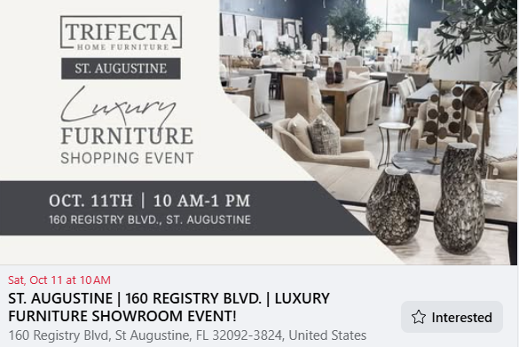 Located near the new ABC liquor store off of Pacetti Rd. (near K&B) 150 Registry Blvd. 32092. Click here for their FB page. If you’re just discovering us, we’re here to bring you luxury furniture at an excellent value—30-40% lower than other high-end retailers. Plus, everything is ready for same-day pickup or fast delivery! (I have been there, beautiful furniture!) The store is open approximately every two weeks in this location. When you go in – if you see something you want … grab a rep, lots on the floor, and have them put a SOLD note on it. Items move very fast.
