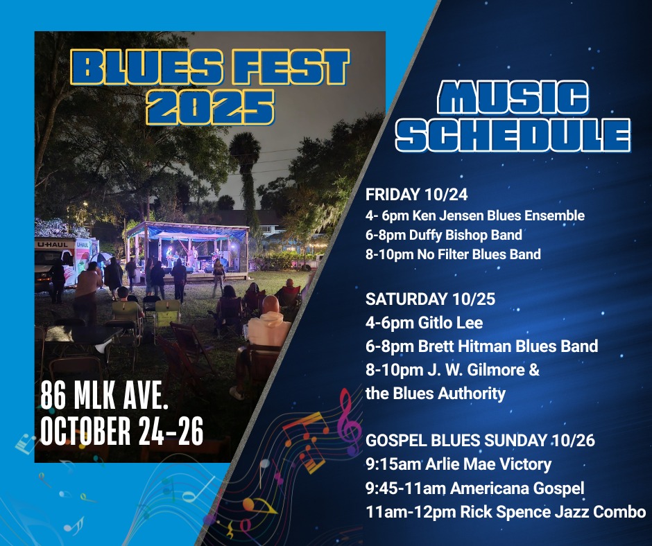 The festival will take place at St. Benedict the Moor Catholic Church, located at 86 Martin Luther King Jr. Avenue. It features live blues music, home-cooked food including gumbo and BBQ, and desserts. Admission is $7.00, and proceeds benefit the church’s renovation. Friday and Saturday 4-10pm; Sunday 10am-3:30pm. (Watch for updates on their FB page in case of inclement weather cancellations) A limited number of chairs and tables are available, so guests are encouraged to bring lawn chairs. 86 M.L. King Ave 32084. Also, click here, for their FB page.
