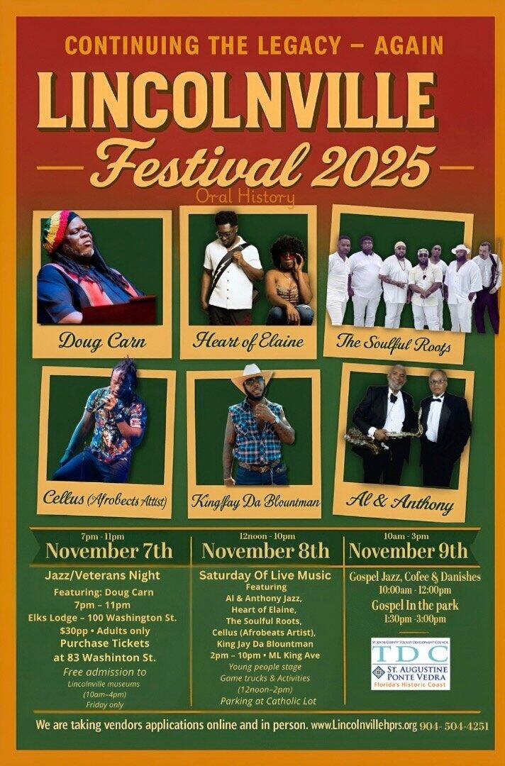 Celebrate the historic Lincolnville neighborhood at the annual Lincolnville Festival, from Friday, November 7, through Sunday, November 9, 2025. This three-day festival highlights St. Augustine’s Lincolnville community, its history, and cultural significance. Click here for the Visit St. Augustine page. From 7:00 to 11:00 p.m. on Friday, November 7; from 12:00 to 10:00 p.m. on Saturday, November 8; and from 10:00 a.m. to 3:00 p.m. on Sunday, November 9, 2025.