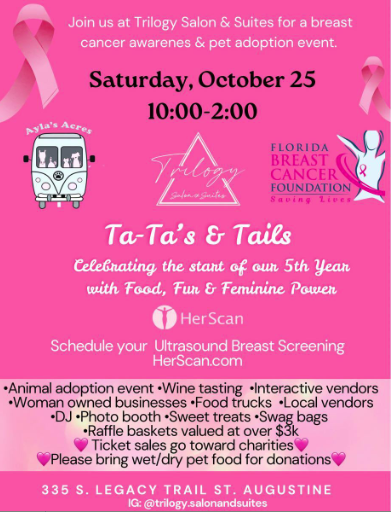 Trilogy Salon & Suies 335 S. Legacy Trail 32092 (in same area as Caddyshack and Renaissance Hotel). Celebrating the start of our 5th year with food, fun & feminine power. Scheuld your ultrasound breast screening at herscan.com Animal Adoption event, wine tasting, interactive vendors, DJ, Photo booth, sweet treats, swag bags and more see flyer below. Click here for their FB page.
