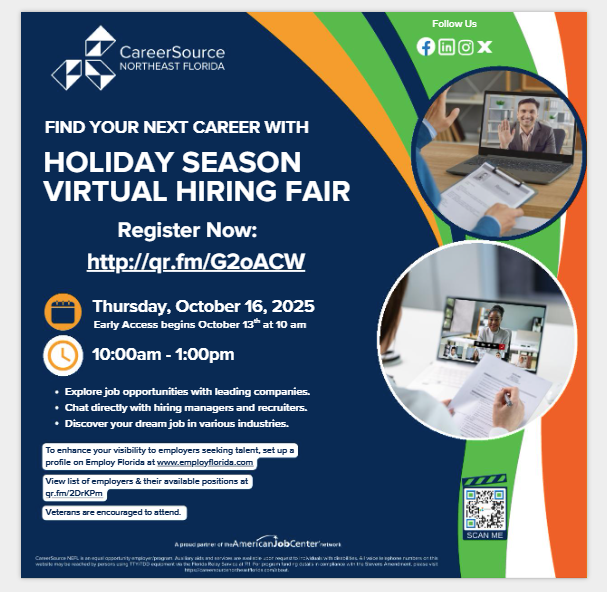 You are invited to participate in the Holiday Season Virtual Hiring Fair, sponsored by CareerSource Northeast Florida. This event will take place on Thursday, October 16, 2025, from 10:00 AM to 1:00 PM, with early access for job seekers beginning Monday, October 13th at 10:00 AM. Please Note: