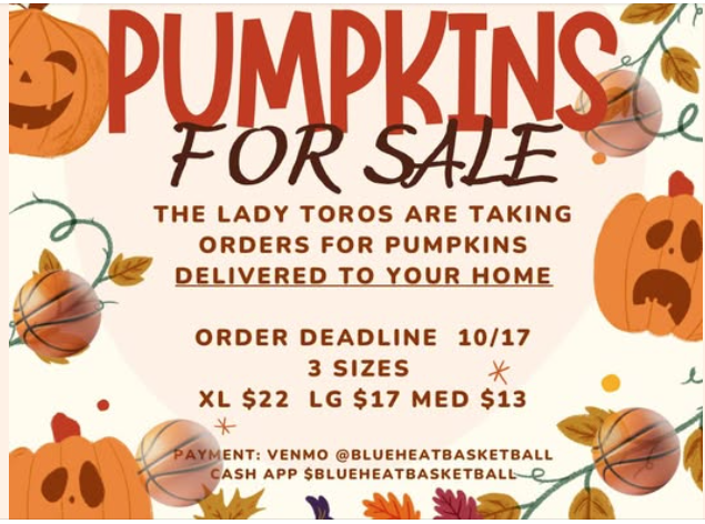 Now – Tocoi Creek Girls Basketball Fundraiser PUMPKINS FOR SALE … Order deadline 10/17, 3 sizes XL $22; LG $17; MED $13 delivered to your home. Info on FB, click here.