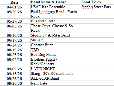 4/1 US Air Force Jazz Band to Perform April 1st at 6:30pm FREE Pop Up Concert at Pier Park – Food Truck is Steph’s Street Eats. Music by the Sea kicks off with this special opening night performance starting at 6:30 PM featuring professional Air Force musicians bringing jazz, swing, and soulful sounds to the beach. Come early, grab a spot, and enjoy the full experience with local art, food trucks, and live music all in one place. Bring your chairs, your crew, and make a night out of it.