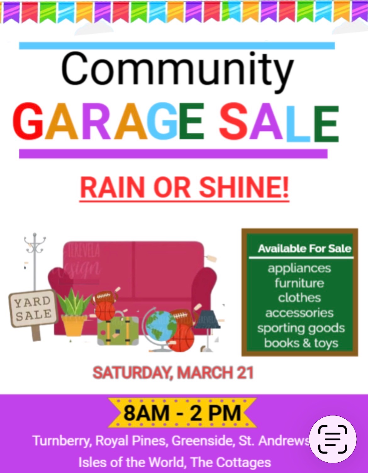 3/21 Turnberry, Royal Pines, Greenside, St. Andrews, Isles of the World, The Cottages all 8am-2pm