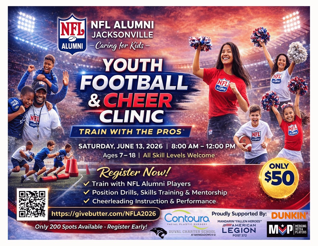 NFL – Youth Football & Cheer Clinic – Train with the Pros. Register now deadline to register is 5/27. $50 pr child. Open to all boys & girls; Ages 7-18; All skill levels welcome. Limited 200 participants. Click on this link for the details: https://givebutter.com/nfla2026 The clinic is June 13. Limited 200 participants.