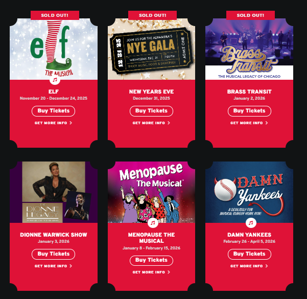 Alhambra Dinner Theatre – … tickets for their After Dark shows go quick. Click here to see all shows and click on tickets. “Sorry sold out” … order your tickets when you see a show you want to attend … asap!