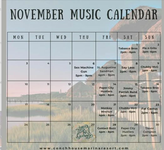 Conch House – click here for their FB page. Live Music schedule / 2025 – November
