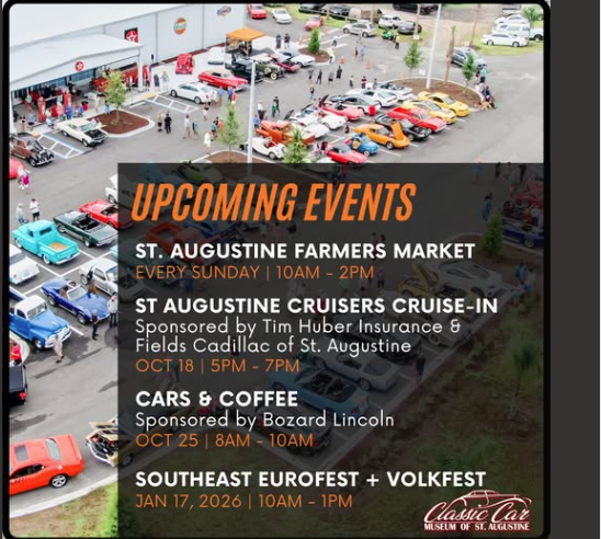 Classic Car Museum of St. Augustine – 3rd Saturday of the Month – 5-7pm Enjoy classic cars, music and door prizes each month at the St. Augustine Classic Car Cruise-in. Click here for mor information about events, i.e. Sunday Farmers Market.